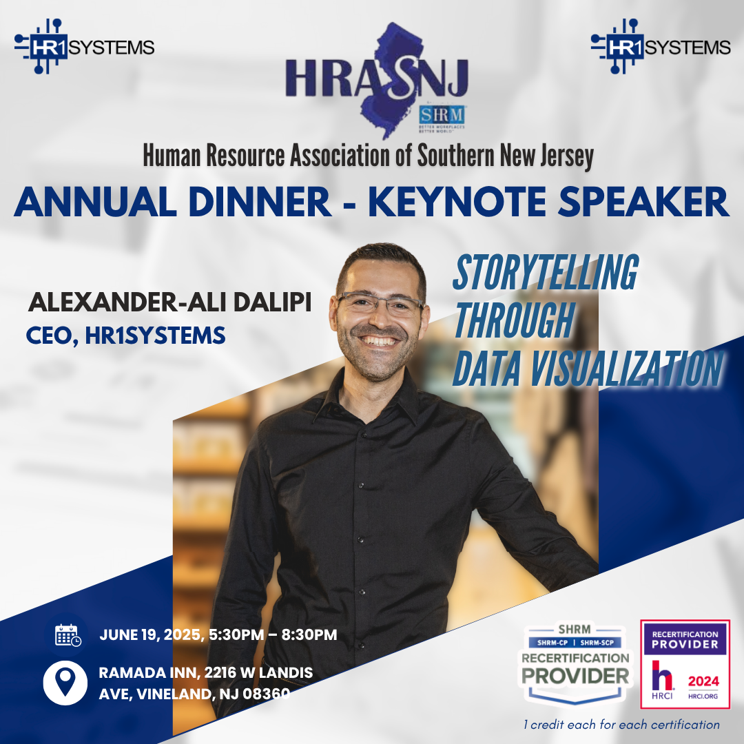 ✨ Join Alexander-Ali Dalipi, on June 19, 2025, at the Human Resource Association of Southern New Jersey’s Annual Dinner for his Keynote talk, “Storytelling Through Data Visualization.”